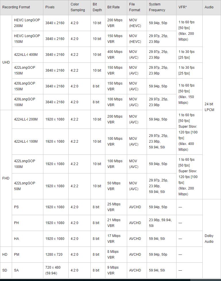 | 支持高質量10位圖像的多編解碼器記錄在所有模式下都沒有裁剪。 AG-CX350能夠以不同的壓縮率記錄各種格式(見下表)。 它 可以在SD存儲卡上以高圖像質量的10位錄製UHD / 60p視頻。 它還採用了新的高效HEVC編解碼器(LongGOP,10位元,4:2:0,MOV)。 當使用具有第7代Intel Core i7處理器的PC時,硬件加速可實現本機解碼和回放。 免費軟件,如VLC Media Player或QuickTime Player,可在筆記本電腦或配備Intel Core i7 的 MacBook上流暢播放。 |