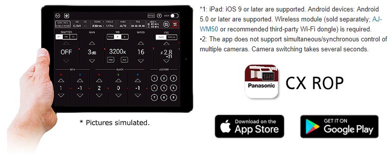 AG-CX350可通過平板電腦 / 智能手機App遠程無線控制(可從App Store或Google Play免費下載)。 除了變焦,i.Zoom和聚焦鏡頭控制,該應用程序還可以遠程控制各種其他功能,包括相機設置,圖像質 量調整,REC啟動/停止和菜單設置。 更重要的是,該應用程序可用於選擇最多八個攝像頭控制的攝像頭。 |