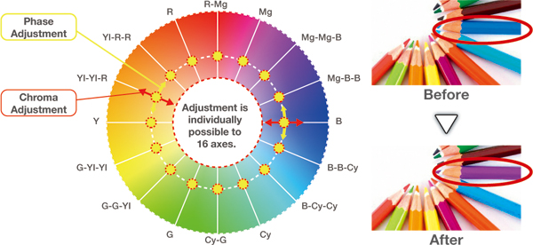 | 此功能為視頻圖像的16個相位中的每一個提供獨立的效果。 它可以在相同的照明條件下以及創意圖像渲染中實現多個攝像機的顏色匹配 |