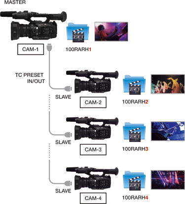 | TC PRESET IN / OUT端子(BNC)允許同步多機拍攝中的時間碼的初始值。 相機編號(0到16)可以添加到錄製文件夾的名稱,以方便編輯。 (僅當使用MOV / MP4編解碼器進行錄製時。 必須在每個攝像機中進行設置。) |