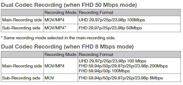 | VFR Recording Frame Rate | When [SYSTEM MODE] = 59.94 Hz 30p mode: 2, 15, 26, 28, 30, 32, 34, 45, 60 (fps) 24p mode: 2, 12, 20, 22, 24, 26, 28, 36, 48, 60 (fps) SYSTEM MODE = 50.00, Hz 25p mode: 2, 12, 21, 23, 25, 27, 30, 37, 50 (fps) |