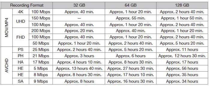 | Recording Time | FHD 50Mbps 32 GB: Approx. 1 hour 20 min. 64 GB: Approx. 2 hour 40 min.. 128 GB: Approx. 5 hours 20 min FHD 8Mbps 32 GB : Approx. 8 hours 30 min. 64 GB : Approx.Approx. 17 hours 10 min 128 GB:Approx. 35 hours |